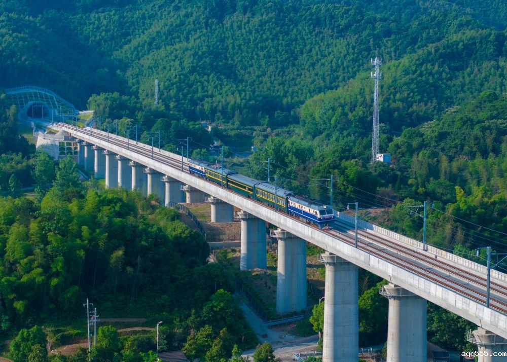 2024年5月18日,杭温高铁检测列车驶出山星岩隧道(无人机照片)。新华社发(吴杰琛 摄)